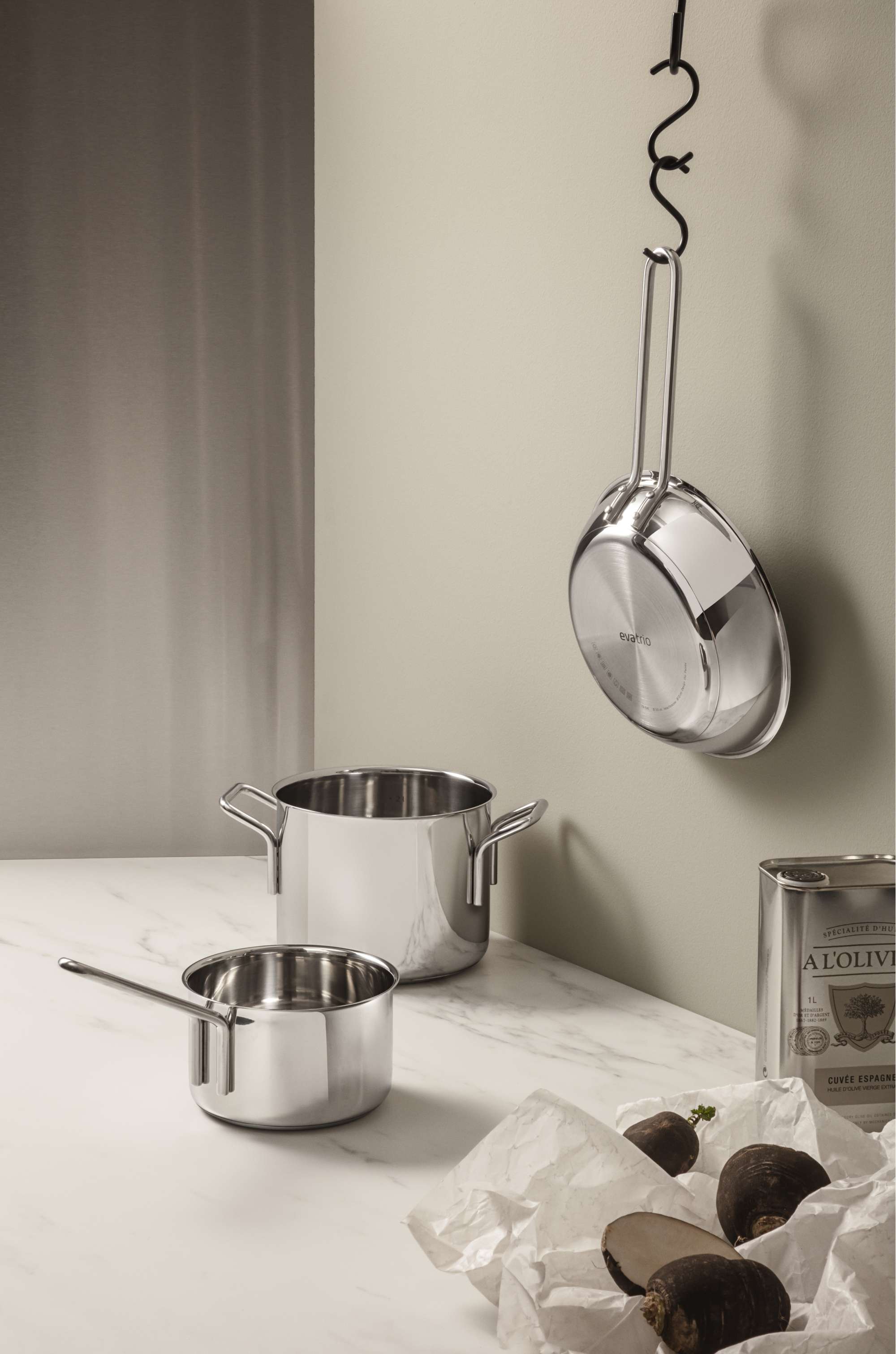 Tackle any cooking task with a complete starter set consisting of three practical pots in different sizes, as well as a frying pan. The set is ideal for cooking for one or two people. The body of the pots and frying pans is made from 90% recycled post-consumer stainless steel, a material that is extremely durable, long-lasting and easy to keep clean and looking good. The design is based on the classic Ole Palsby/Eva Trio design from 1977, ensuring compatibility with existing Eva Trio lids. The pots and pans are dishwasher safe and are suitable for all types of heat sources.