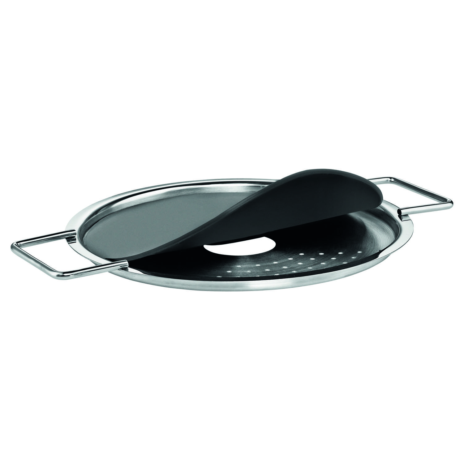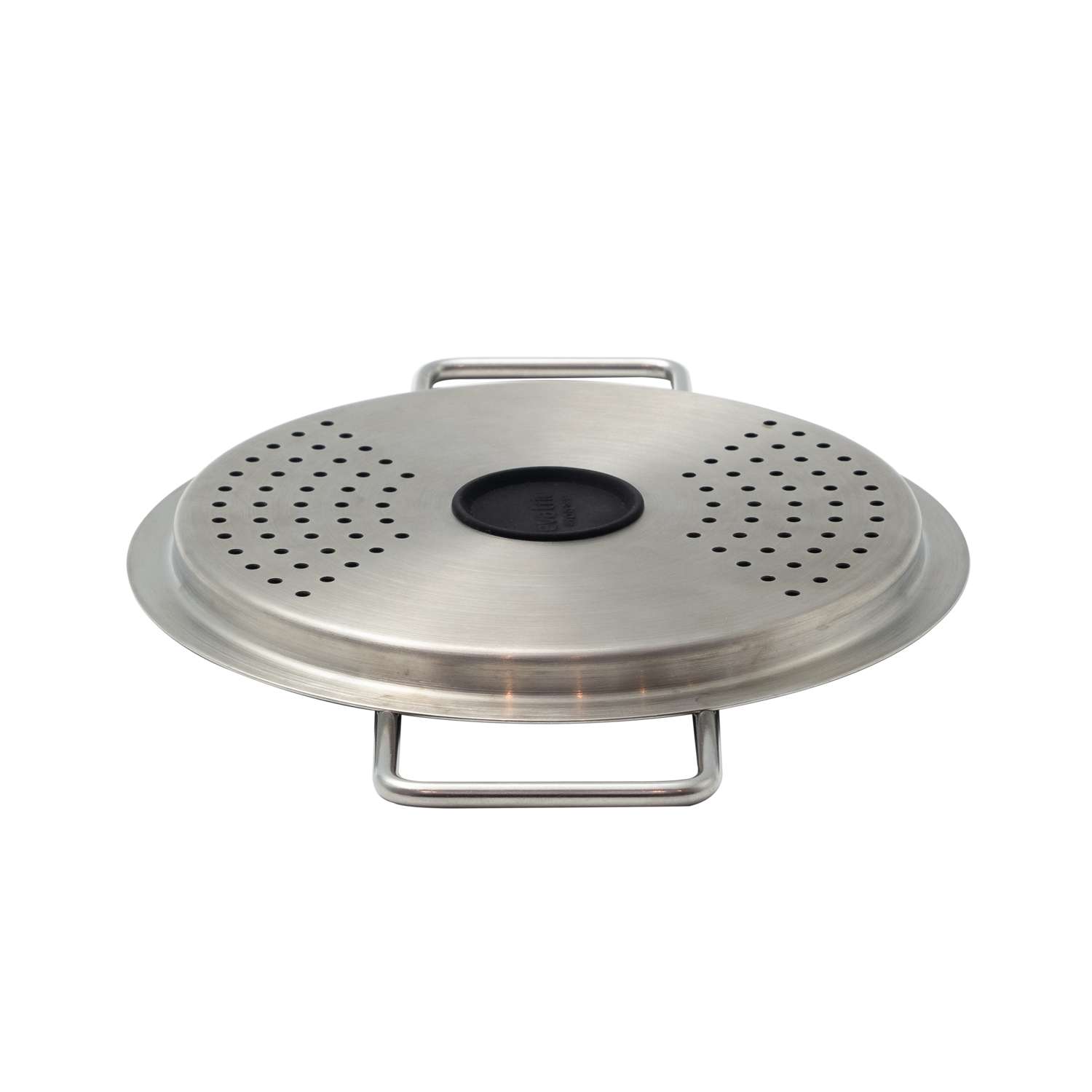 The draining lid features an integral sieve for draining liquid from the cooking pot. The sieve has a silicone cover to retain heat and moisture. As you tip to pour, the silicone cover is automatically released from the lid so the liquid can run out. The lids are stackable or hangable. The flat design allows you to place plates or bowls on the lid to keep them heated while you cook. The steel part of the lid is made of 90 per cent recycled post-consumer steel. All pots, pans and lids from Eva Trio are made in standard sizes, making them stackable and combinable across all designs and materials. This kitchen-friendly solution gives you the freedom to pick just the lid you require, while reducing the number of lids needed. Eva Trio lids are sold individually and are both oven-safe and dishwasher-safe.
