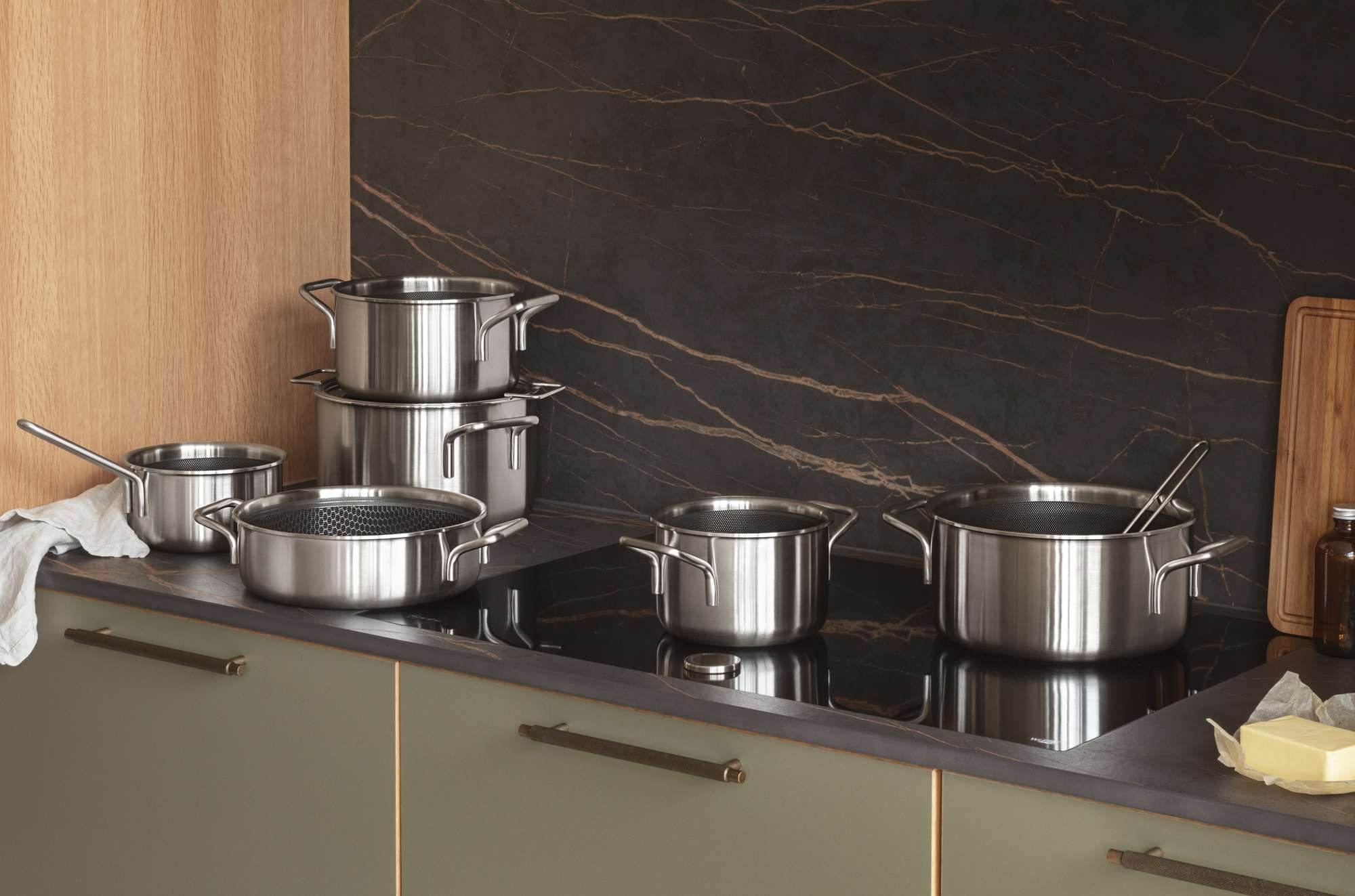 This cooking pot unites Eva Trio’s design features and renowned quality with next-generation enhancements and materials. The interior is coated with a striking pattern consisting of stainless steel at the top and a ceramic Slip-Let® non-stick coating at the bottom. This combination reduces the risk of ingredients sticking or burning on, while the coating is so durable that you can safely use metal utensils without the risk of damaging it. The body of the cooking pot is made of a combination of 90 per cent recycled post-consumer stainless steel and 100 per cent recycled post-consumer aluminium. The unique Multi-layer sandwich design ensures rapid heating, even heat distribution and a tough exterior resistant to wear and tear. The pot is oven-safe up to 400 °C and is compatible with all heat sources, including induction. It is easy to clean in a dishwasher or with a steel scourer. This cookware is based on the classic Ole Palsby/Eva Trio design from 1977, which ensures that it still offers the renowned Eva Trio features such as cold handles, a pouring lip, stackability and compatibility with lids and other items in the Eva Trio range.