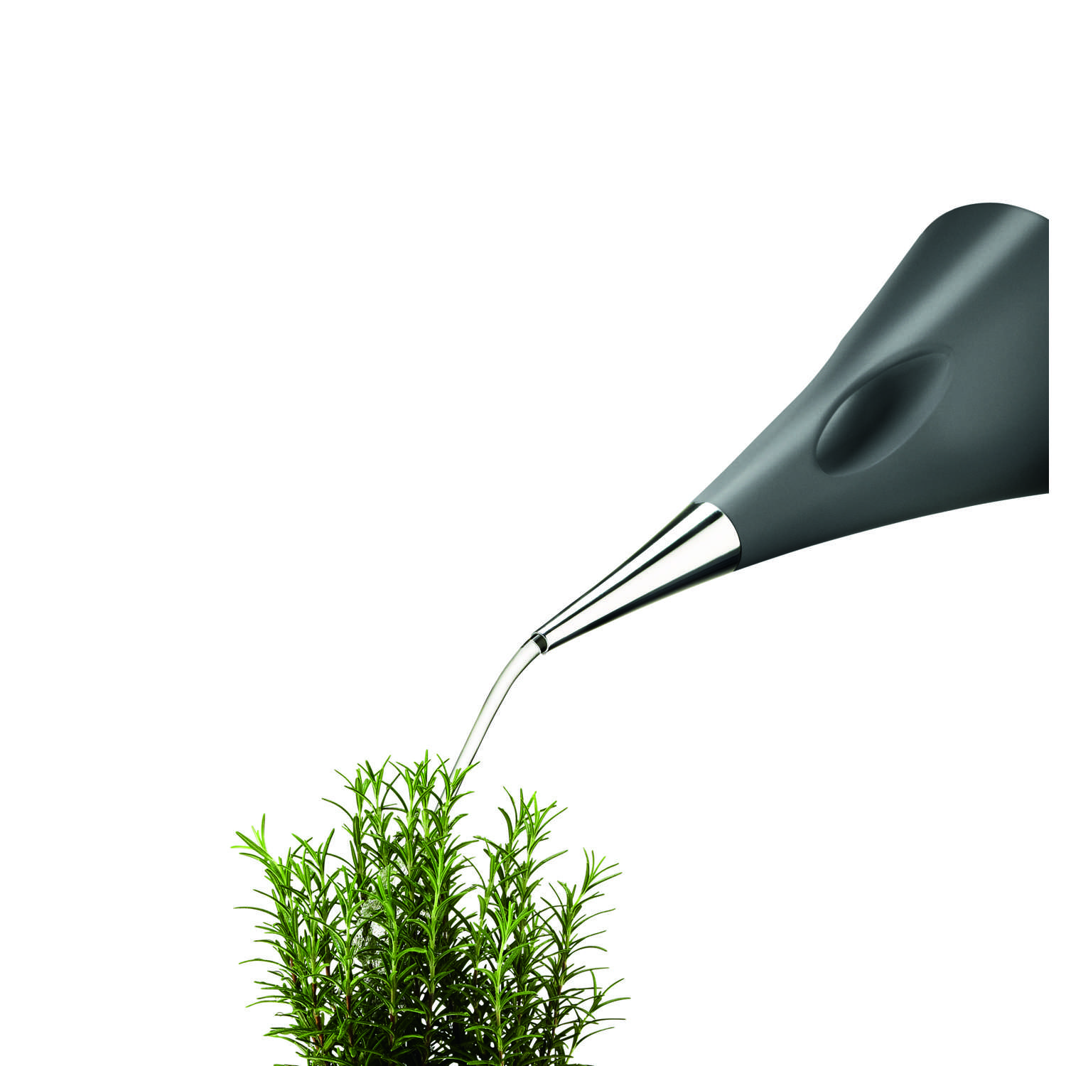 This minimalist watering can is designed to be on display so it is always ready to hand. The pointed spout facilitates watering even small pots and produces an even stream of water. Remove the spout to fill the watering can. Made of plastic and chrome plastic. Keep inside when not in use.