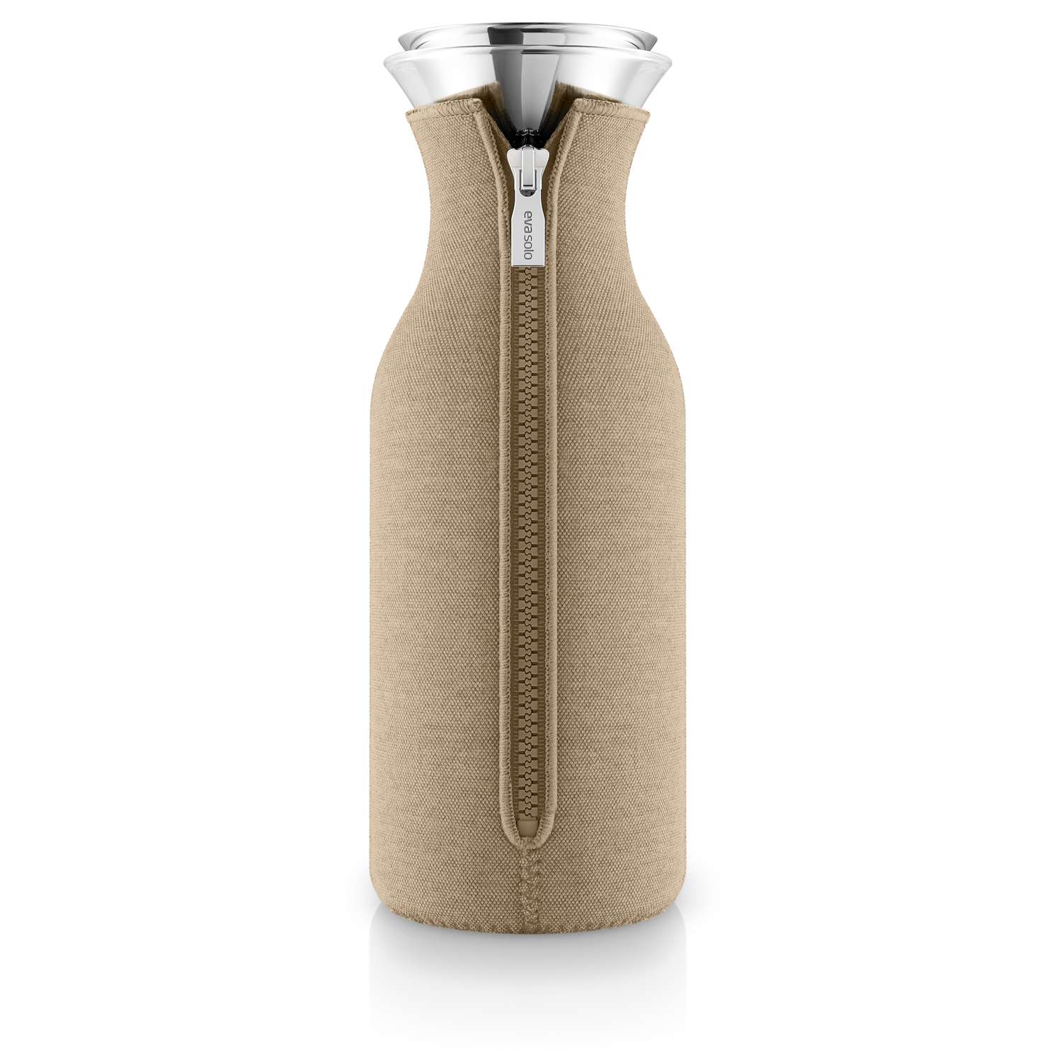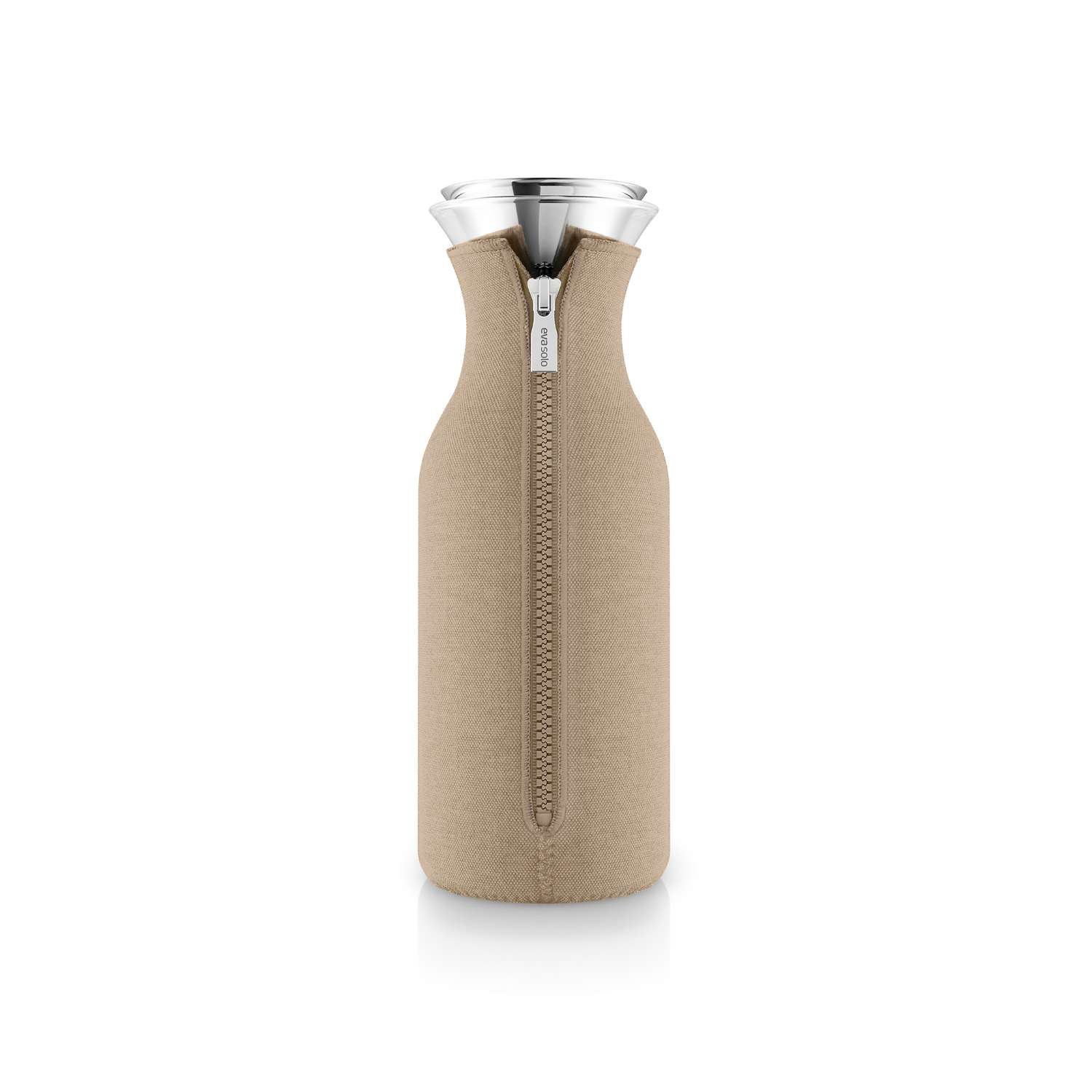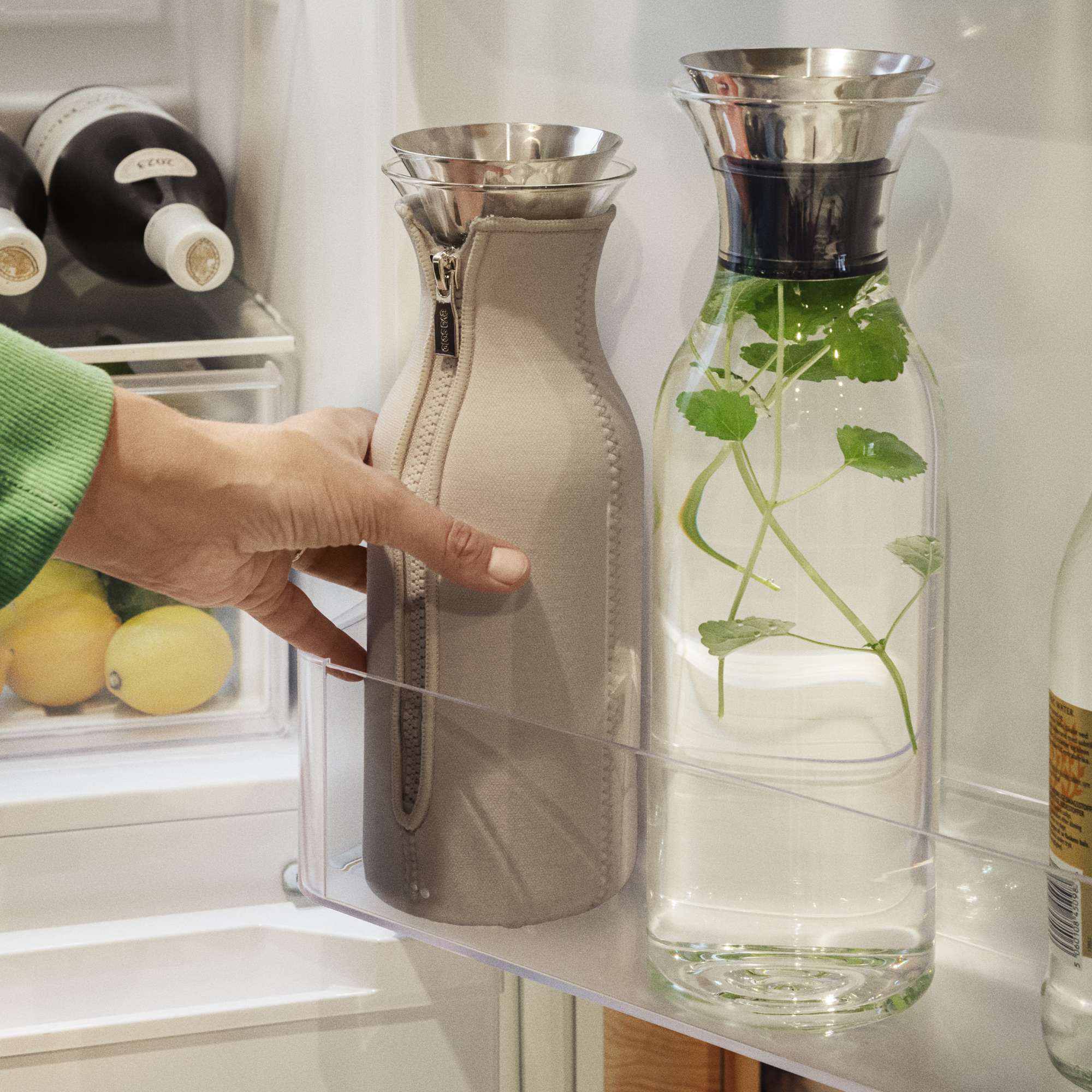 The carafe fits most fridge door shelves and is ideal for both cold and hot refreshments. The 100% drip-free stainless steel pouring lip ensures that the contents end up in your drinking glass and not on the tablecloth. The flip-lid opens automatically when you tip to pour, for one-handed operation, and remains sealed when not in use. The distinctive cover makes the carafe nice to handle, helps maintain the temperature of the contents and absorbs any condensation to prevent spots and stains on your kitchen table. The cover is made of neoprene with a woven textile exterior. The glass and metal parts are dishwasher-safe. The cover is machine-washable at 30 °C.