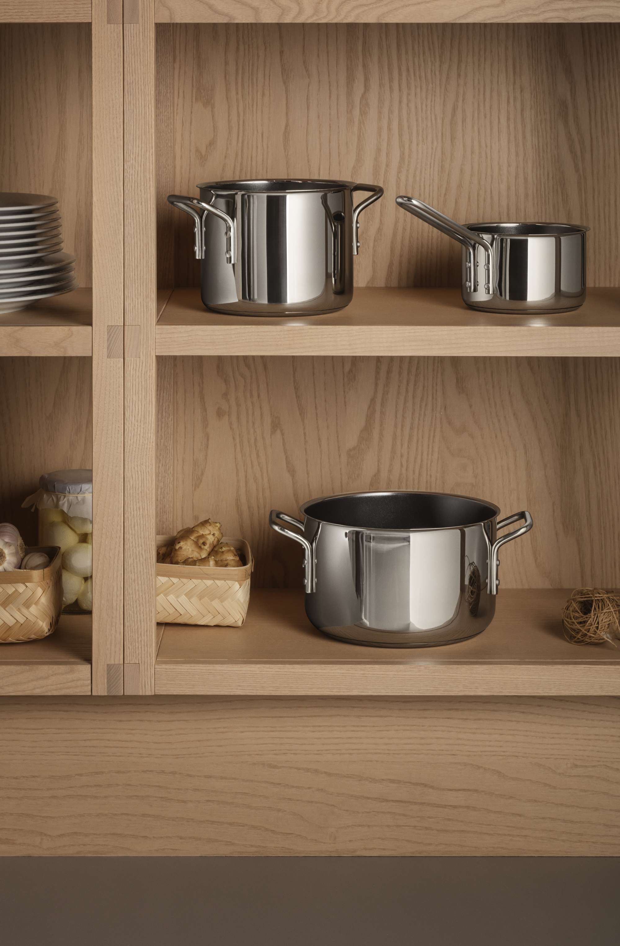Meet all your everyday cooking needs with a complete set of pots. The set consists of three practical sizes that make it possible to handle everything from large simmering dishes to cooked sauces. The body of the pots is made from 90% recycled post-consumer stainless steel and features a ceramic Slip-Let® coating that effectively prevents food from sticking and burning, making cooking and cleaning easier. The design is based on the classic Ole Palsby/Eva Trio design from 1977, ensuring compatibility with existing Eva Trio lids. The pots are ovenproof up to 400°C, scratch-resistant and are suitable for all heat sources. They are also dishwasher safe.