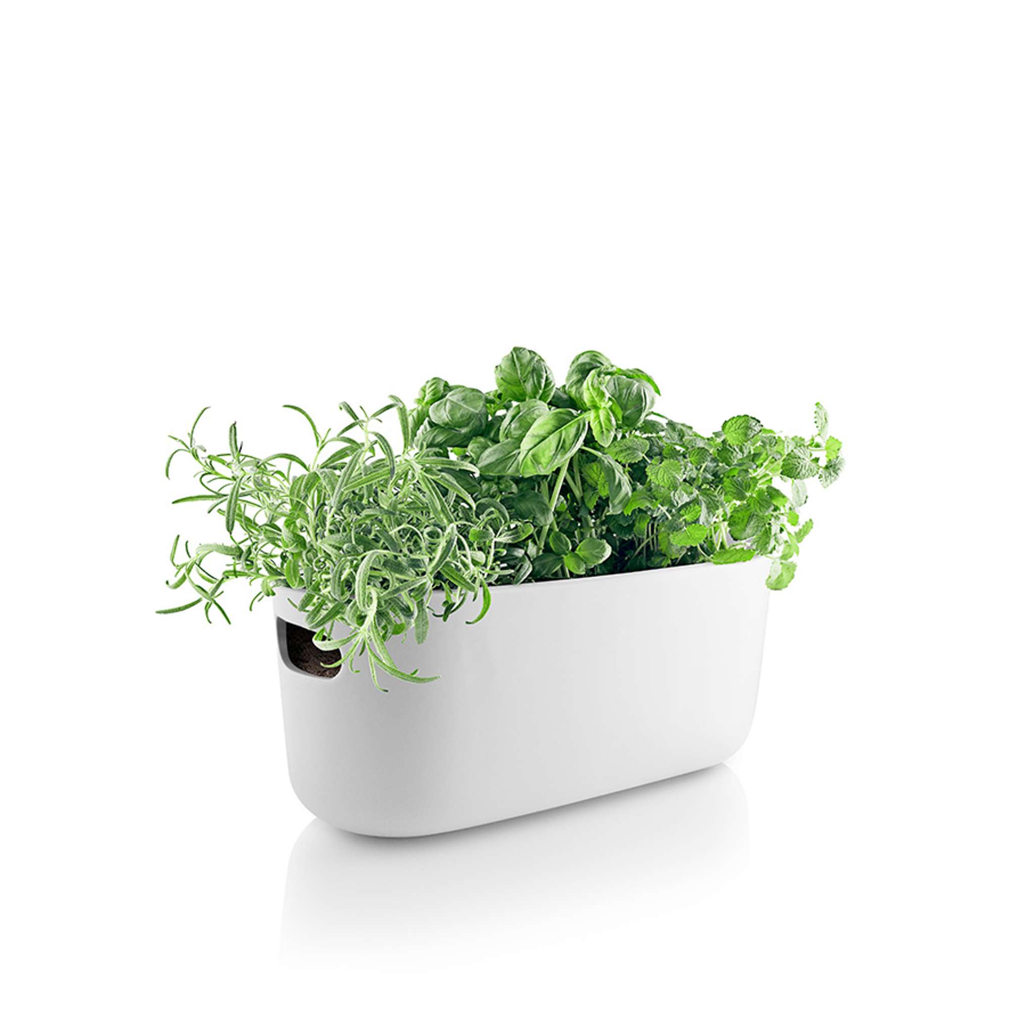 Grow your own herbs in the kitchen – and let them look after themselves. The herb organiser’s self-watering system keeps your herbs fresh for several days at a time if necessary. The herb organiser provides optimum growing conditions as the herbs sit on a capillary mat which absorbs the water in the reservoir at the bottom of the pot and transports it to the plants. The water reservoir holds up to 500 ml of water, so all you have to do is to fill it regularly, and then you can rely on the pot to do the watering. The herb organiser has a convenient carrying handle at each end, so it’s easy to move around.