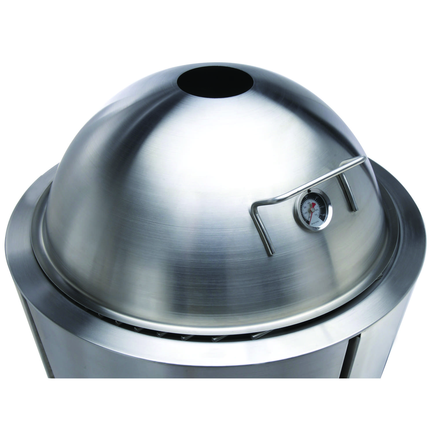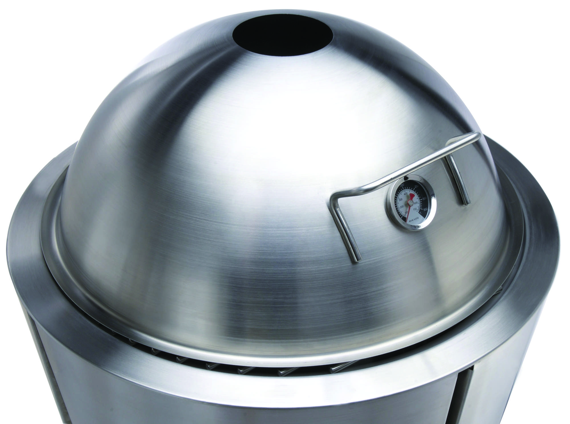 Stekelokket gjør det mulig å få en varmluftseffekt i grillen, noe som gir deg flere tilberedningsmuligheter, og termometeret gjør det enklere å holde øye med temperaturen mens lokket er på. Lokket kan henge på siden av grillen.
